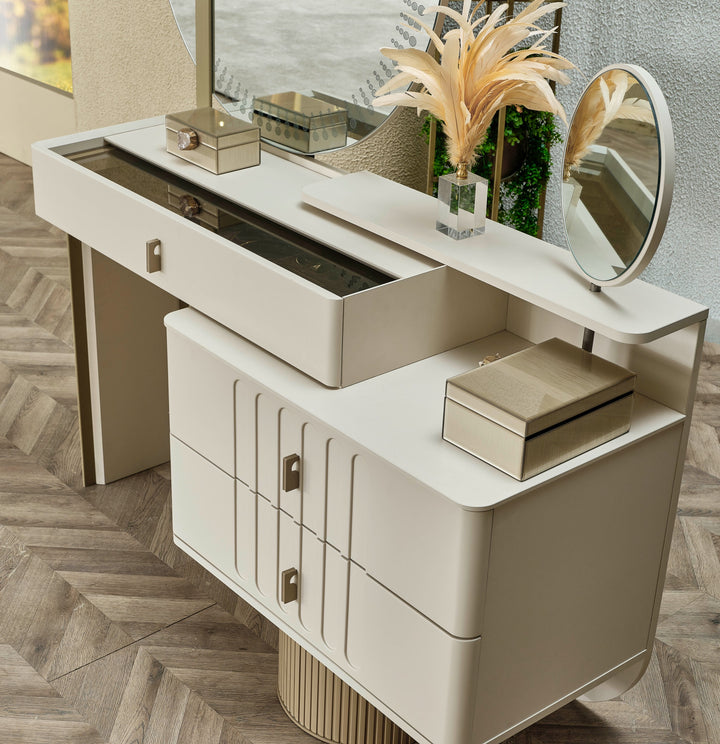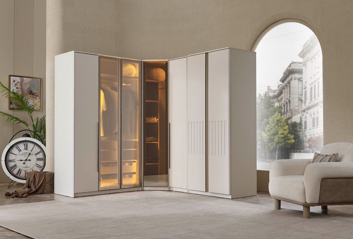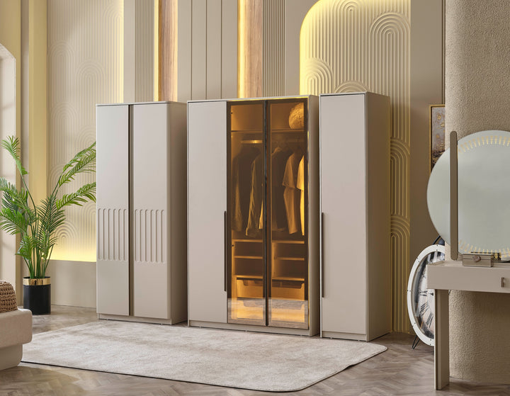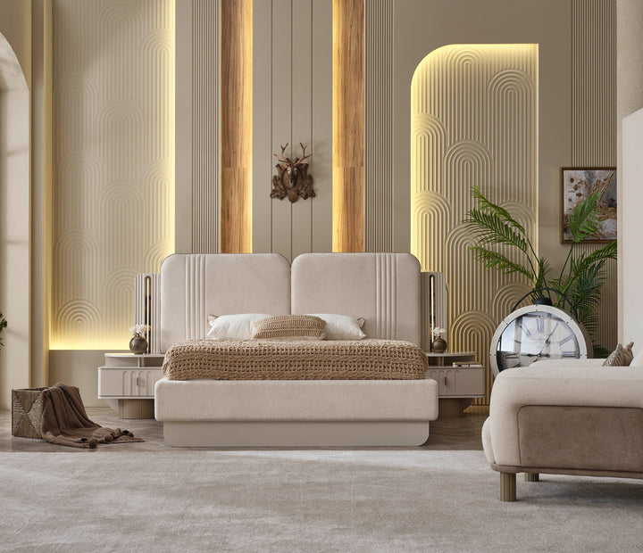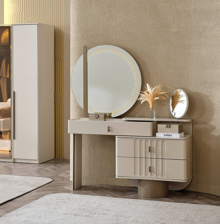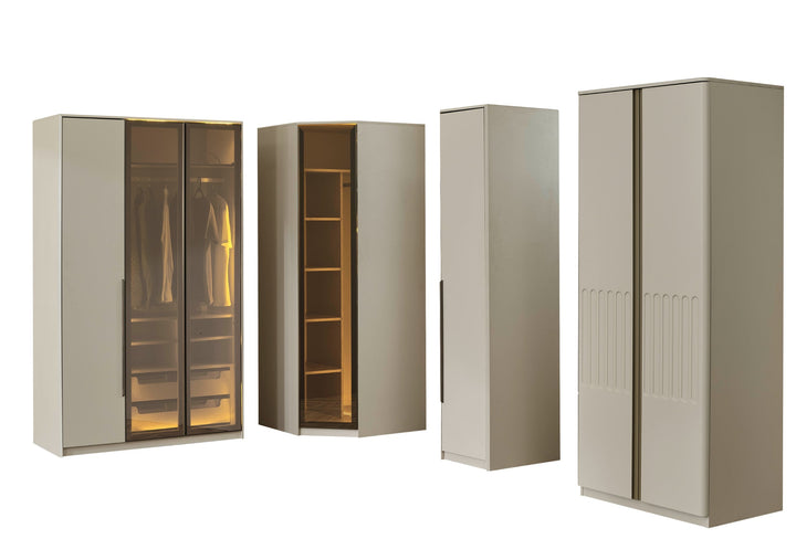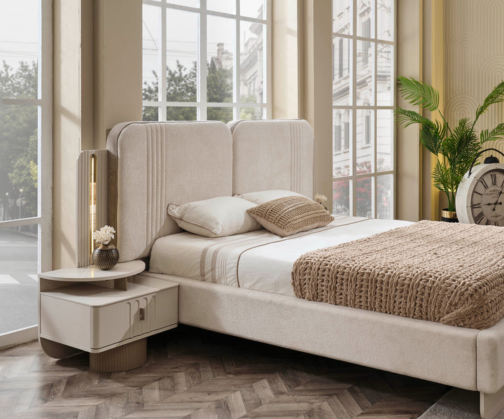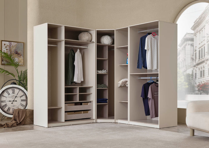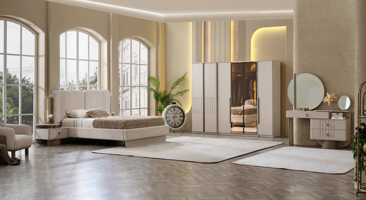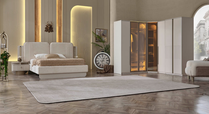يشمل: سرير واحد، 2 طاولة جانبية (كومودينو)، خزانة ملابس، وطاولة تزيين.